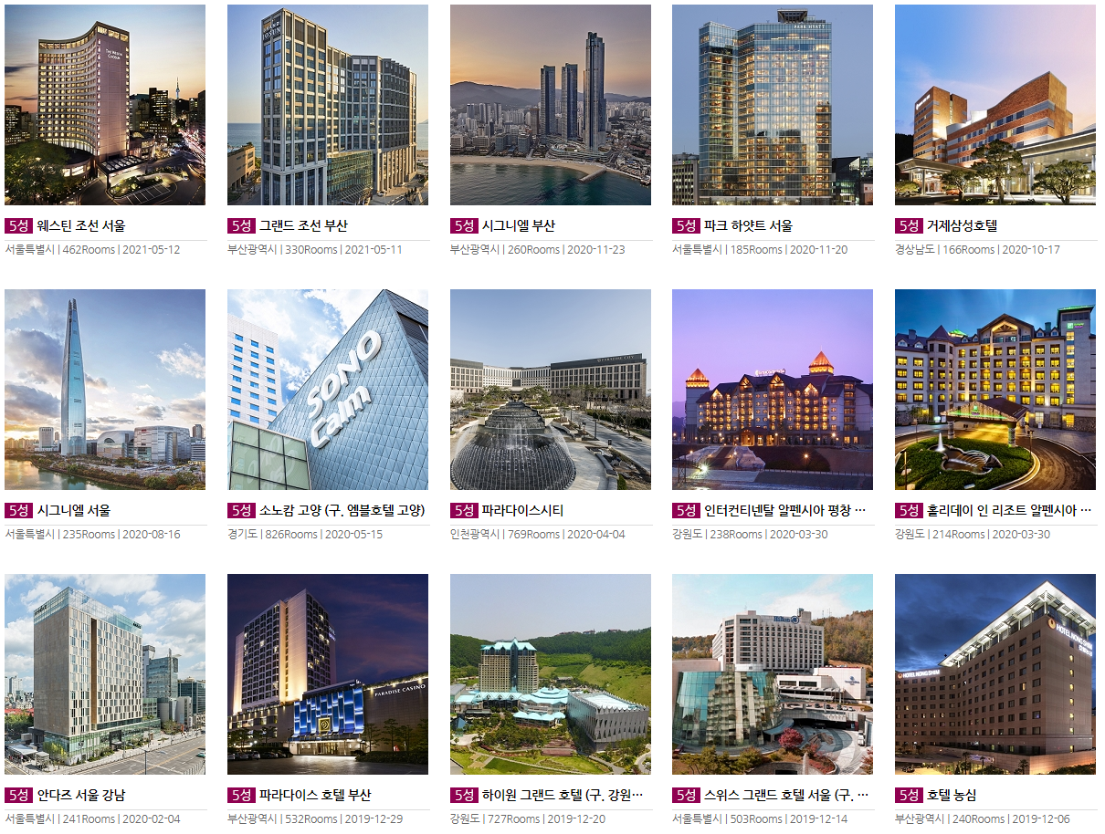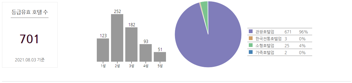 2021년 8월 3일 기준 대한민국은 총 701개의 호텔이 등록되어있으며 2성급과 3성급 호텔이 가장 많은축에 속합니다. 일부 5성급호텔을보면 여러분들이 많이 들어보셨던 호텔들입니다. 이제 자신이 예약한 호텔이 정말 이 등급평가를 받았고, 알맞은 등급평가가 되었는지는 해당사이트에서 검색하시면 손쉽게 확인 가능합니다.