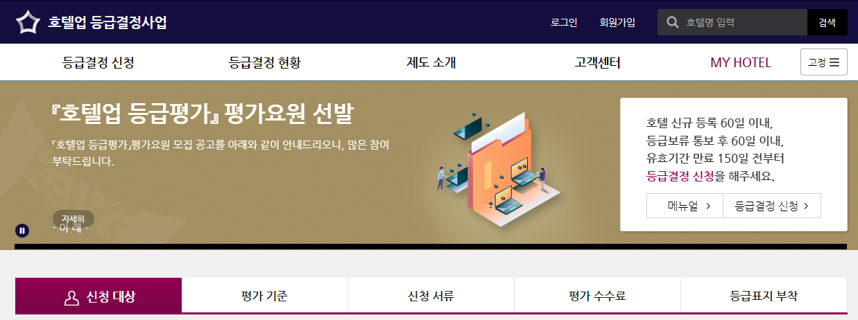 물론 한국도 처음부터 별모양을 사용했던것은 아닙니다. 과거에는 무궁화로 표시했지만 2015년을 기점으로 문화관광체육부에서 호텔등급결정사업을 통해 한국관광공사를 주관 기관으로 지정하여 별 등급제를 도 하였을만큼 역사가 짧습니다. 호텔업 등급결정사업 사이트는 아래와 같습니다. 바로 해당 기관에서 호텔의 등급을 결정해주지요.