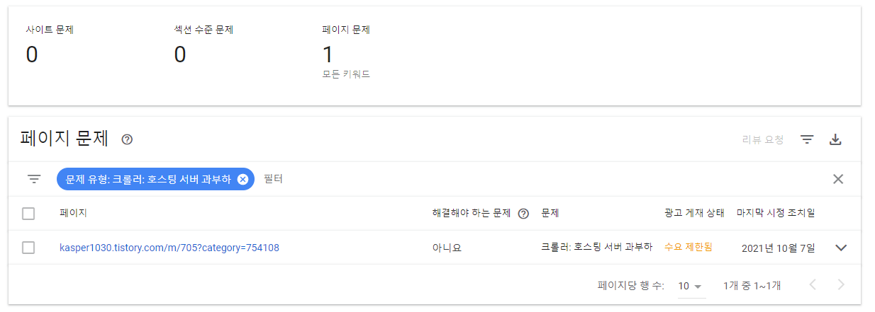"문제 유형: 크롤러: 호스팅 서버 과부하" 라고 뜨면서 광고 게재 상태가 수요 제한됨 이라고 뜹니다. 그러나 실상 자신의 블로그의 아무 글이나 클릭해보면 정상적으로 광고가 나옵니다.