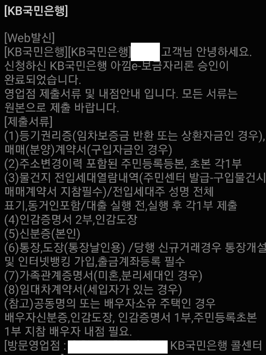 한국주택금융공사의 대출승인 문자 이후 약 3일이지난 잔금치루기 D-27일 쯔음 KB은행에서 문자가 온다.잔금 지급을 위한 최종 서류 제출이다.