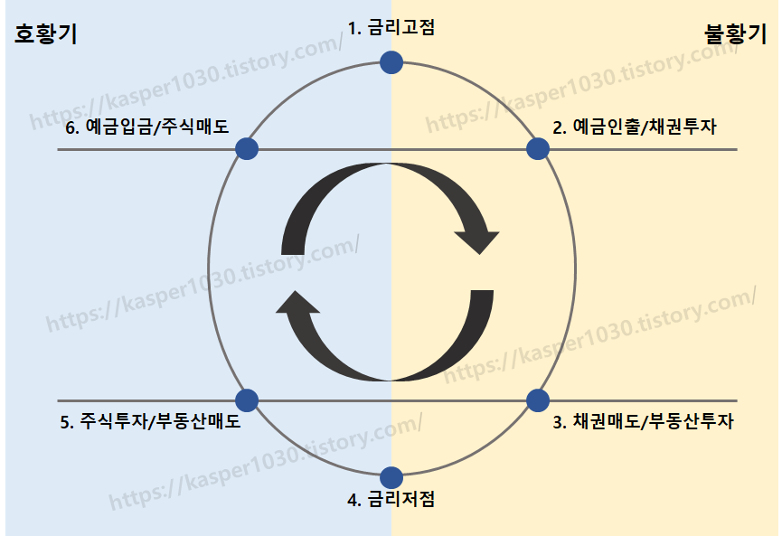 최고 투자자가 워렌 버핏이라고도 말할 수 있지만, 역사적으로 유명한 투자자라고하면 코스톨라니라고 해도 과언은 아닙니다. 코스톨라니는 시장경제는 아래와 같은 모형으로 정의할 수 있으며 이 모형을 통해 현재 재테크를 어떻게해야할지 판단할 수 있는 참고의 척도라고 하였습니다. 그렇다면 각 구간별 자산흐름과 투자 대응에 대해서 안내해드리겠습니다.