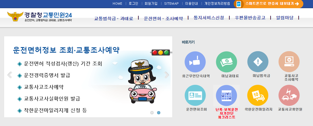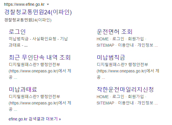 구글 또는 네이버에 "경찰청 교통민원" 또는 "이파인" 이라고 검색하면 아래와 같이 한 사이트가 뜹니다. 해당 사이트는 경찰청 교통민원에 관련된 사이트로 벌점뿐만아니라 운전면허 조회, 무인단속 내역, 미납범칙금, 미납과태료 등 다양한 항목등을 이용할 수 있습니다.