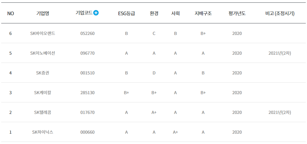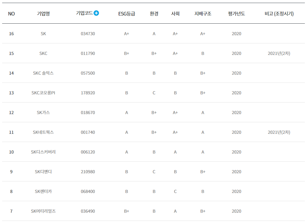 다음은 SK그룹입니다. LG화학에 비해 SK 케미칼은 환경부문에서 B+등급을 받았네요. SK그룹은 SK텔레콤, SK하이닉스, SK이노베이션이 높은평가를 받았습니다.