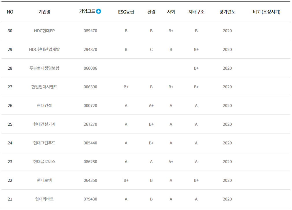 다음은 주요 기업 그룹별 등급을 조회해보겠습니다. 삼성그룹을보면 삼성 공조나 삼성 출판사가 낮은 등급으로 평가받았으며 삼성 SDI, 삼성 SDS, 삼성엔지니어링, 삼성전기, 삼성전자등은 높은 점수를 받은 것을 볼 수 있습니다.