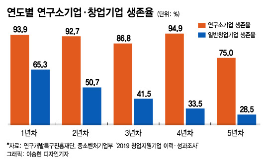 위 그래프는 일반기업과 연구소기업 생존률의 그래프입니다. 기본적으로 일반 창업은 기술력이 대표나 연구소장에 따라 천차 만별입니다. 그러나 연구소기업은 출연(연), 대학교 교수진들이 개발한 기술로 창업하였기 때문에 기술력은 기본적으로 보장됩니다.